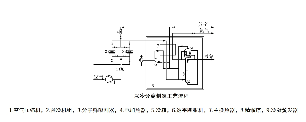 深冷制氮技术的核心在于以空气为原材料,通过一系列复杂的处理过程获取氮气。这个过程涉及空气的压缩、净化以及通过热交换实现其液化成为液态空气。液态空气中主要包含液态氧和液态氮,两者的沸点在大气压下存在显著差异:液态氧的沸点为-183℃,而液态氮的沸点为-196℃。利用这一性质差异,通过精馏技术,可以有效地将液态氧和液态氮分离,从而得到所需的氮气。