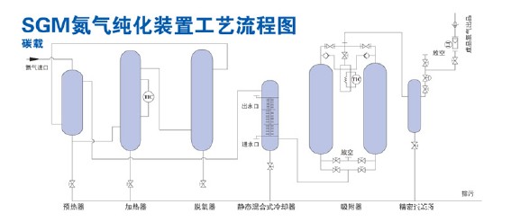 氮气纯化系列装置 气体纯度:≥99.9995% 氧含量:≤2ppm 二氧化碳含量:≤1ppm 露点:≤-60℃ 技术特点: 若用户所需氮气掼标大于99.999%时,在我公司制氮机设备的基础上配置纯化设备。本系列产品采用碳载脱氧催化剂,不需消耗氢气源,碳与氮气中的余氧反应生成二氧化碳,再采用变压吸附工艺除去二氧化碳和水,经过滤后得到高纯度氮吸附工艺除去二氧化碳和水,经过滤后得到高纯度氮气。高纯度氮气技术指标可达O2≤2ppm,CO2≤1ppm,露点≤-60℃。